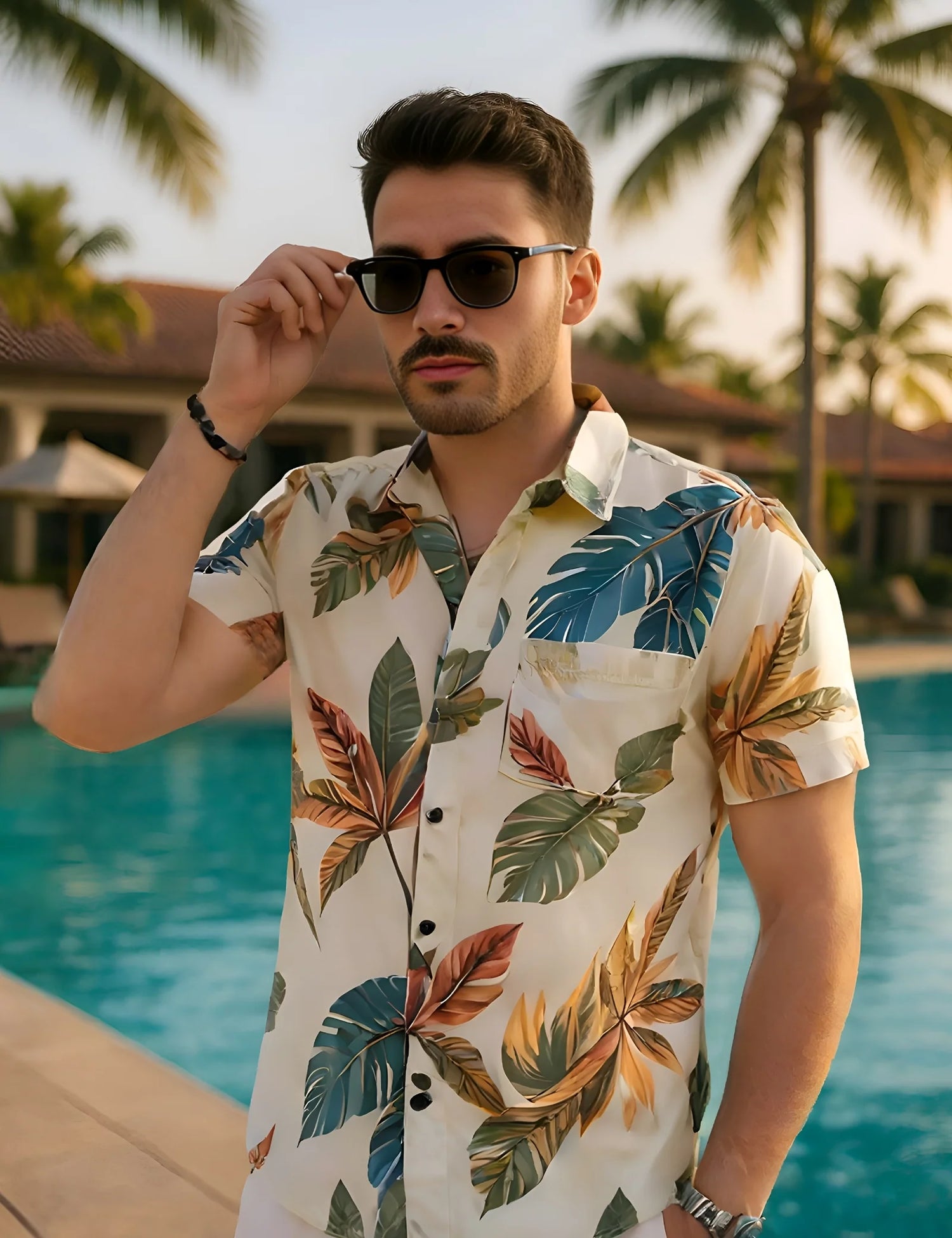 Cream Leaf Printed Easywear Cotton Men's Shirt for Men