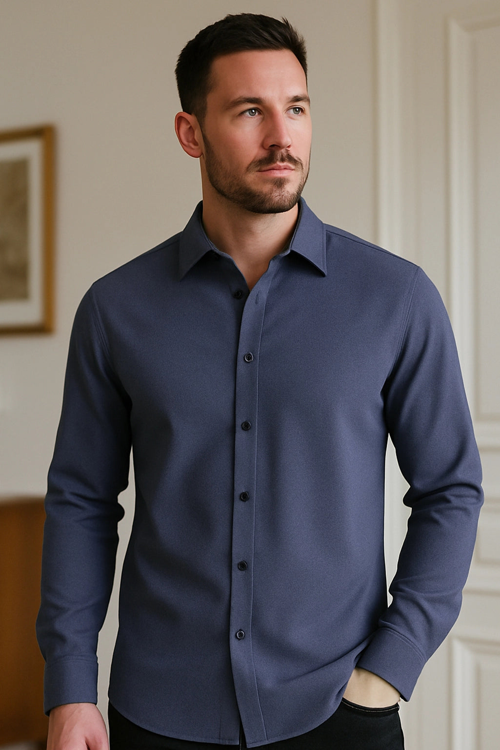 Men Spring And Summer Solid Color Loose Casual Long-Sleeved Shirt Navy Blue Color