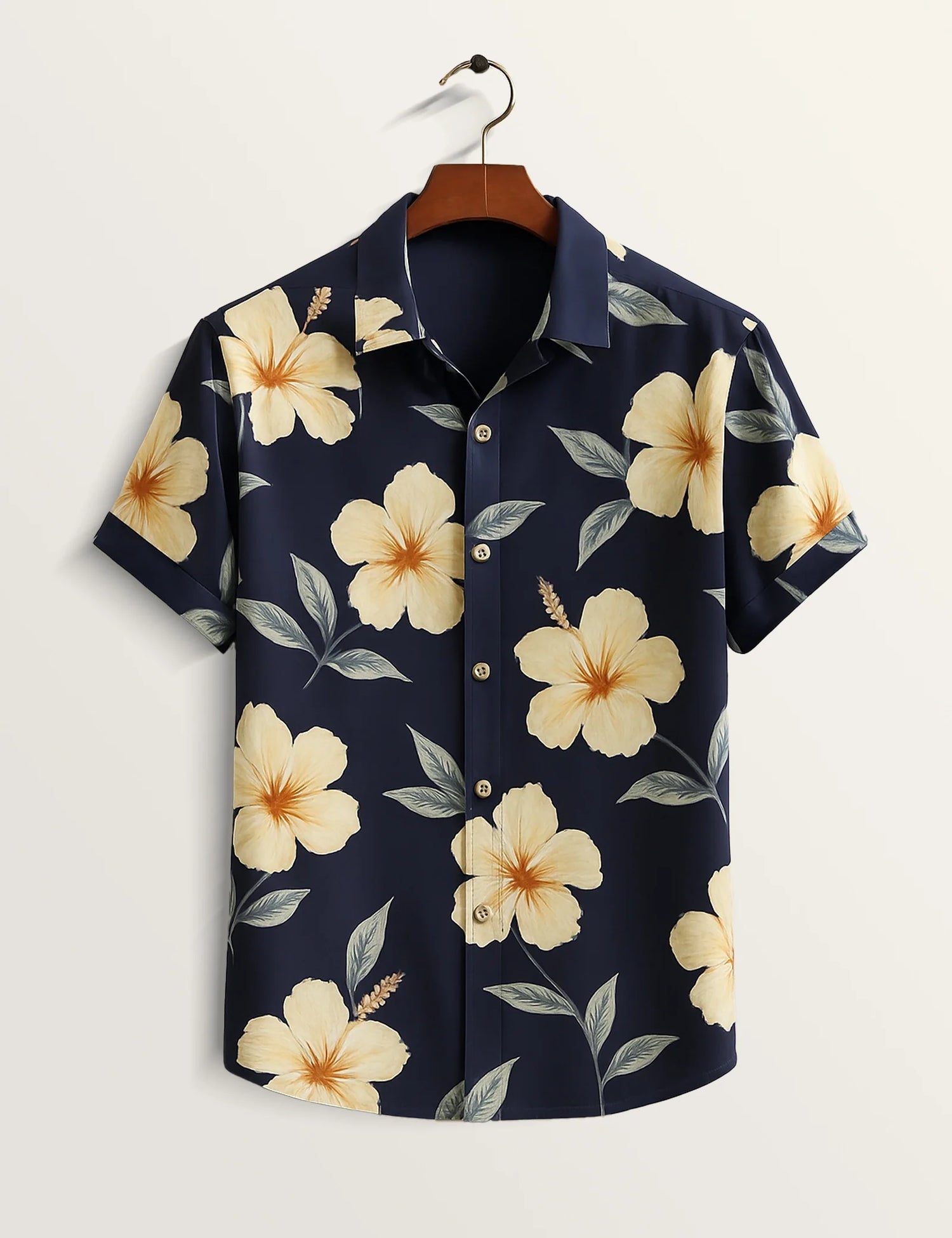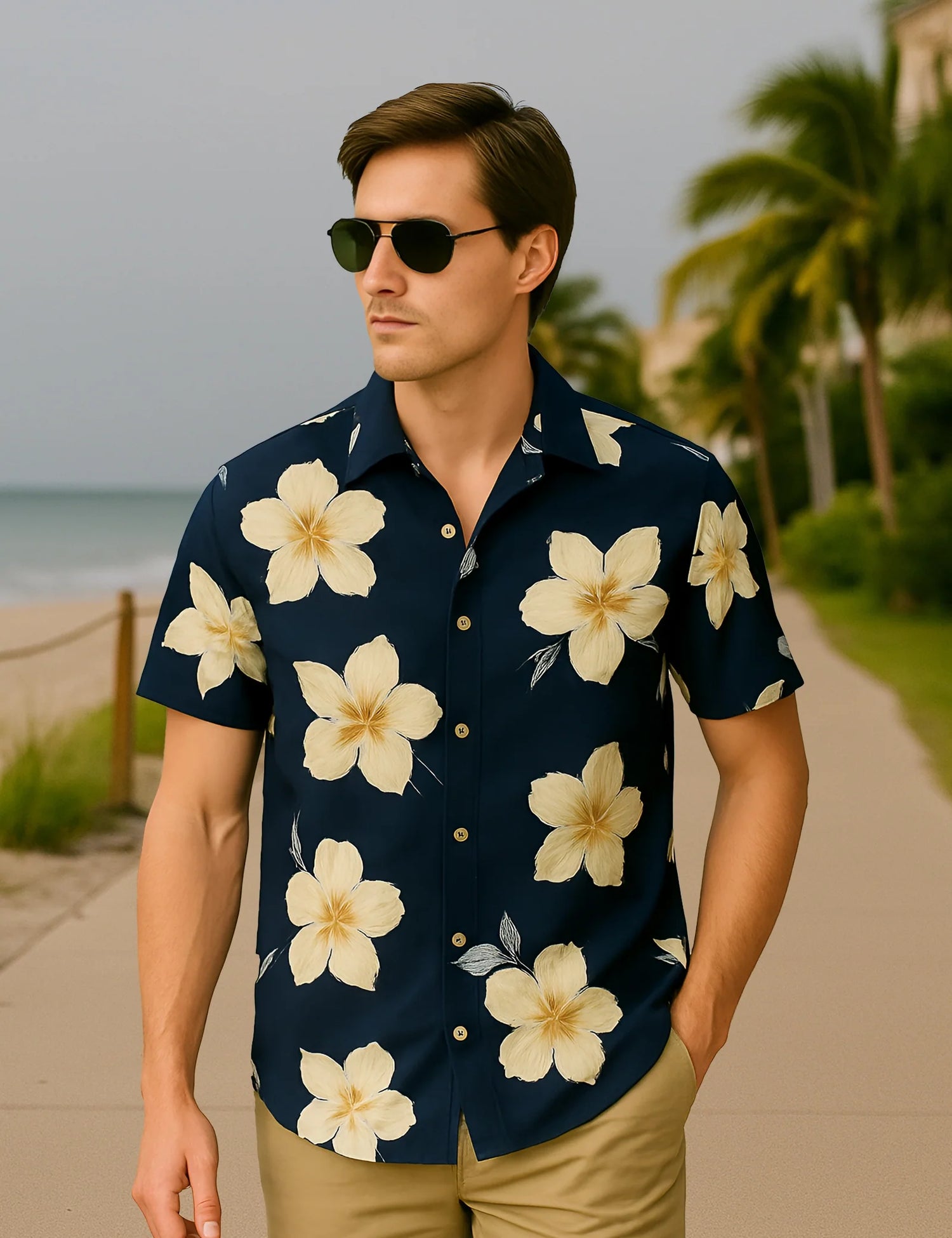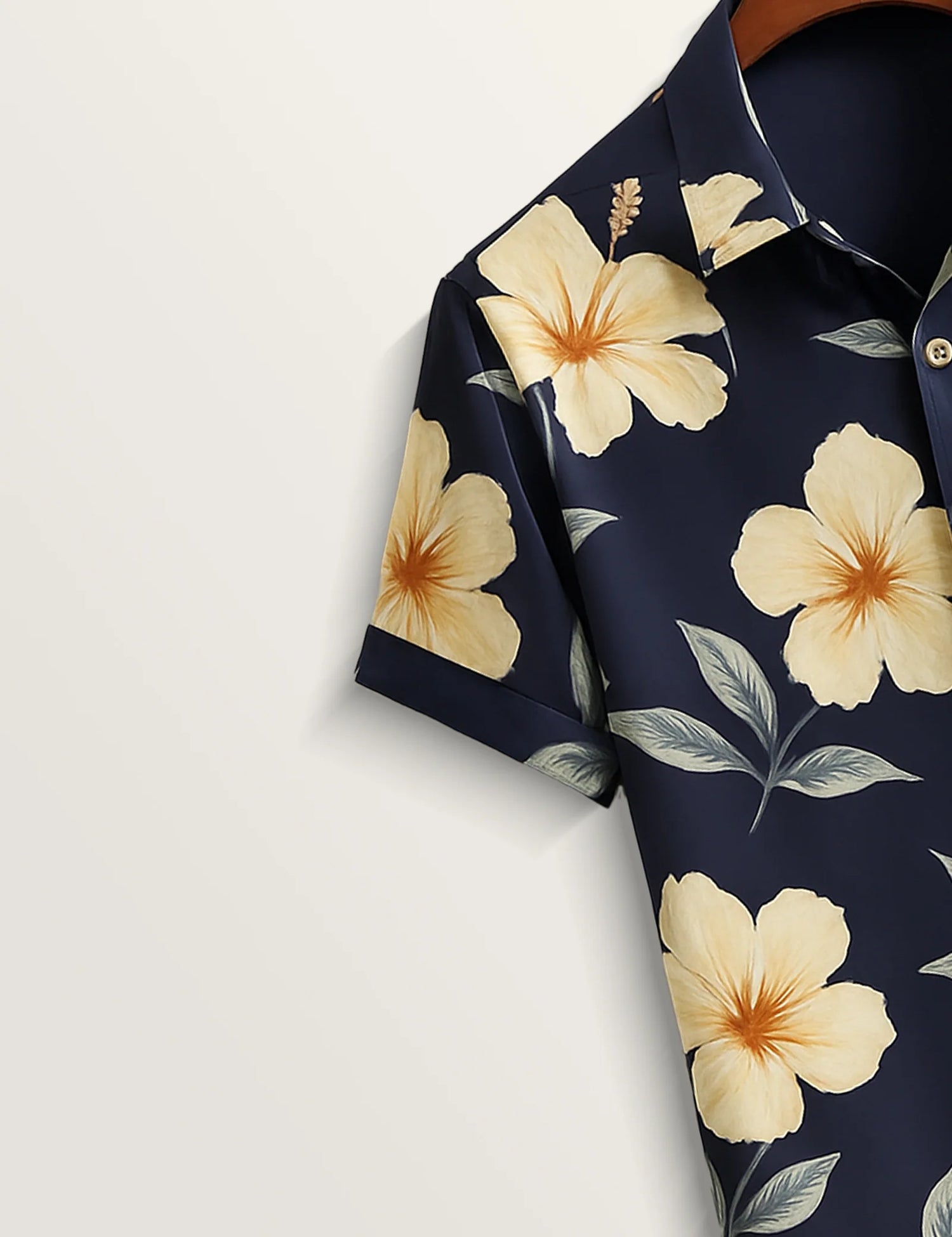 Navy Blue Hibiscus Printed Refined Cotton Daily Shirt for Men